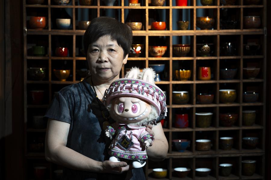 8 июля 2025 года, Чжао Куаньмэй, местная наследница традиционного ремесла по изготовлению этнических костюмов в Эньши-Туцзя-Мяоском автономном округе /пров. Хубэй, Центральный Китай/, демонстрирует традиционную одежду, которую она сшила для Лабубу. /Фото: Синьхуа/
