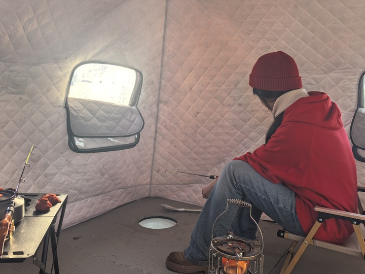 28 декабря 2025 года, участница конкурса ловит рыбу в палатке, установленной на замершей реке Аргунь, на участке территории КПП Хэйшаньтоу. /Фото: Синьхуа/