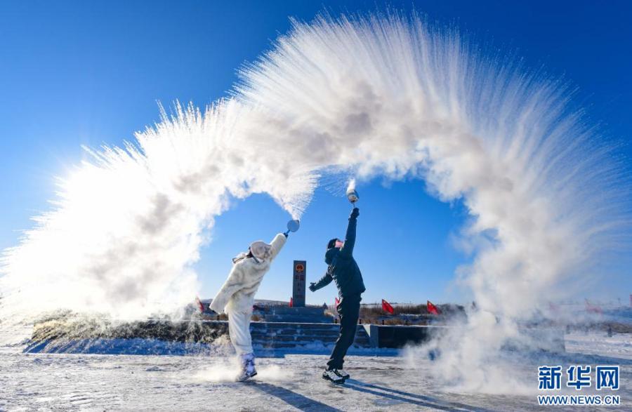23 декабря 2025 года, влюбленная пара развлекается зимней забавой под названием "превращение капель воды в кристаллы льда" в турзоне на территории КПП Хэйшаньтоу. /Фото: Синьхуанет/